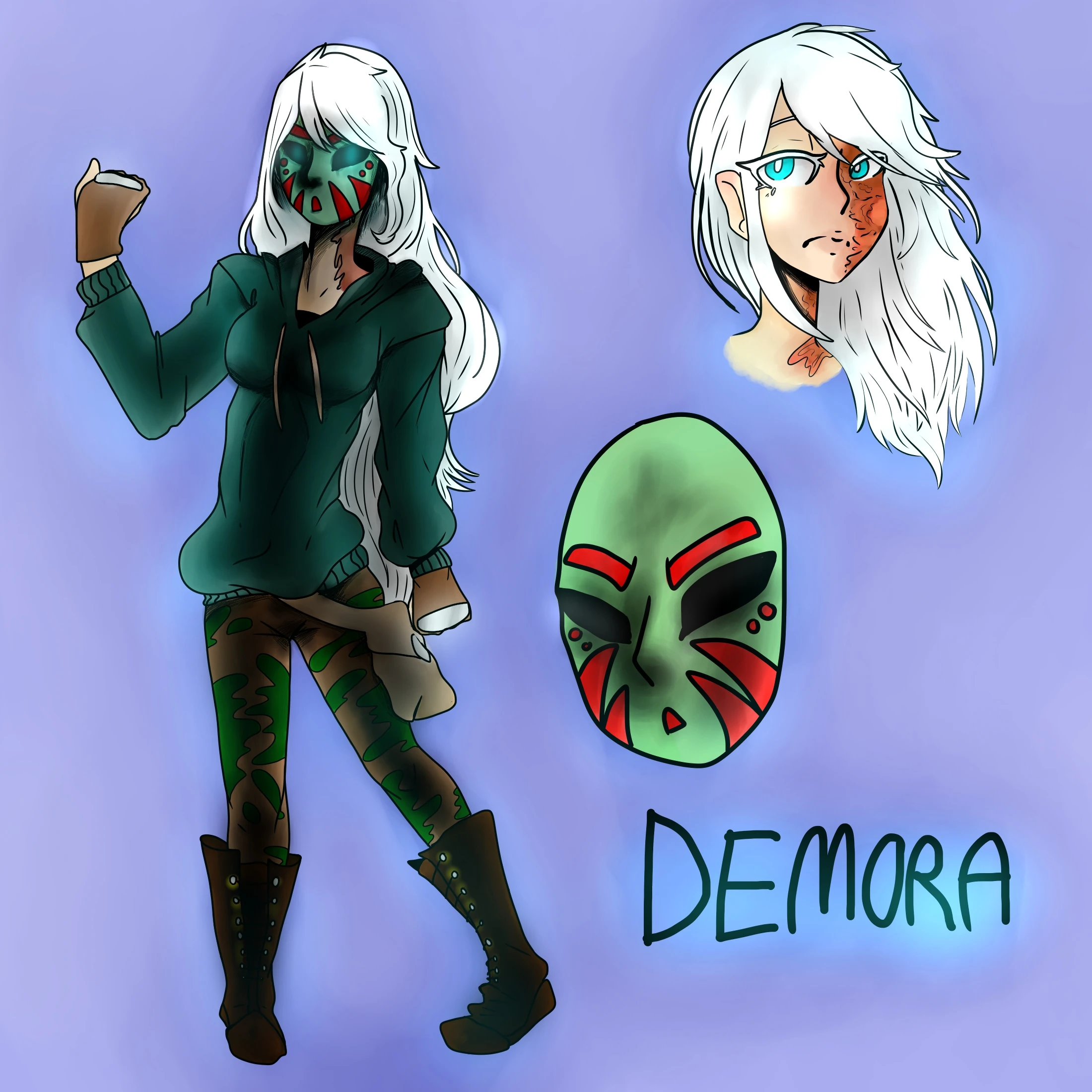 Demora has long pure white hair. Her eyes are mix of ice blue, baby blue, and electric blue. She has pale ivory skin. She is often seen to be wearing a light green faded mask with red markings under her eyes and around where her eyebrows would be located. Her clothes consist of a dark teal hoodie, camo patterned leggings and dark brown combat boots. She wears gloves with iron plating around the fist for maximum damage. She uses a grayish brown messenger bag to carry around weapons and medical supplies for herself.