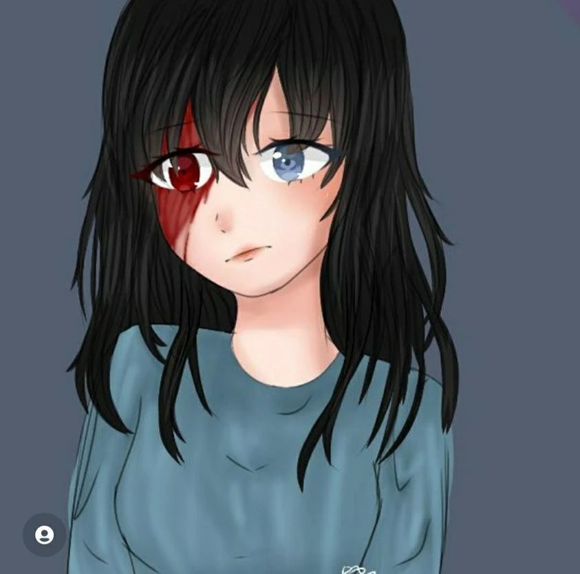 Isabel is black-haired girl with one blue and one bleeding eye. She's pale.She's wearing light blue T-shirt with long sleeves. She's also wearing black trousers with yellow butts. She has got short black shoes too.