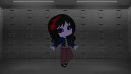 She had light purple skin, black hair with a red headband, Dark Grey Striped Shirt with Dark Denim Jacket, with Pink Jeans. She had black slippers, she also has black eyes with purple iris with black pupils