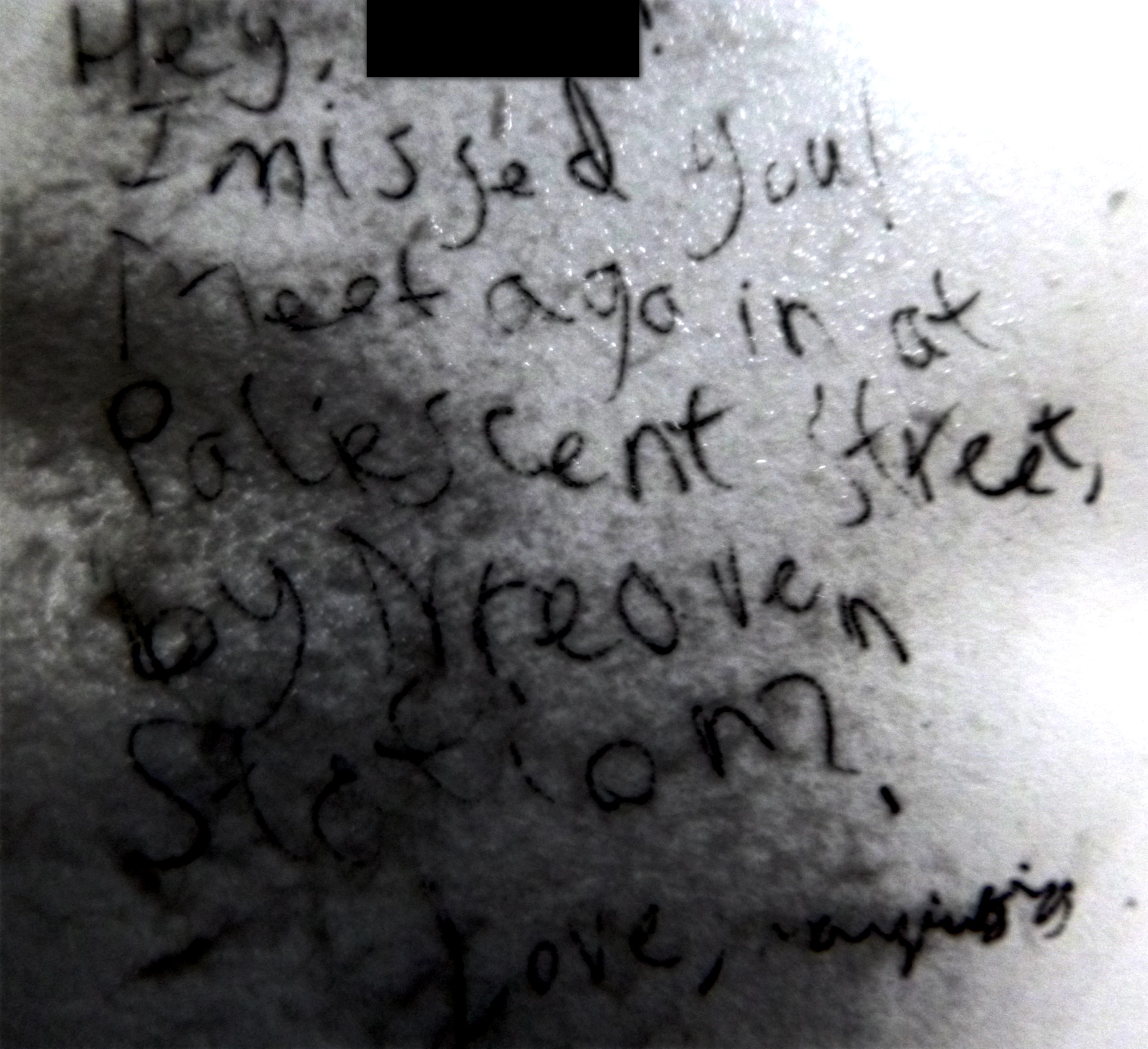 Above, you can see a note. It has that signature, and it's written in ink, and soaked in inky water. These are a few things that connect it to other, various water-soaked notes, left in various homes, all within Britain.