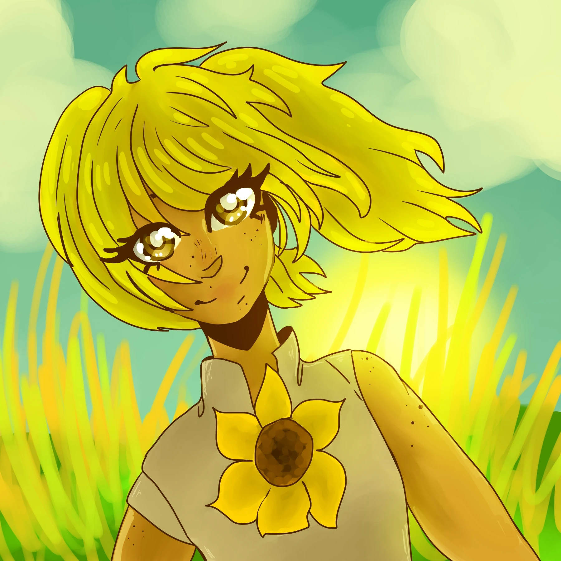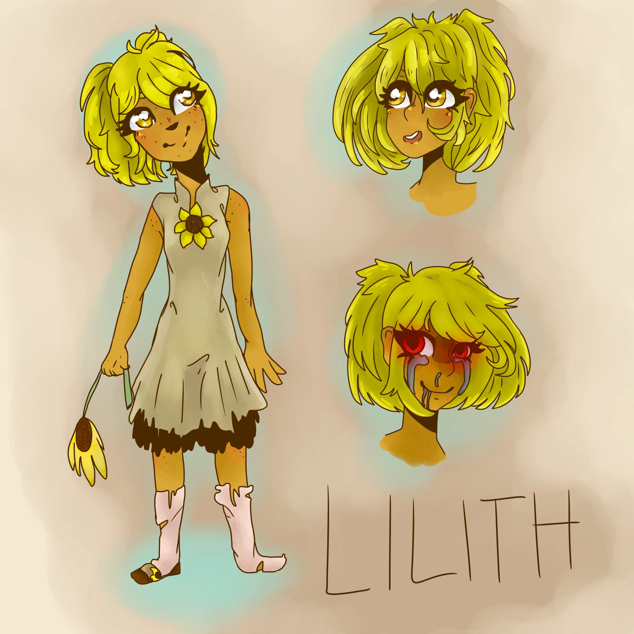 Lilith has tan freckled skin with messy and matted golden hair framing her face. She has oak colored eyes which become crimson when she is possessed by the demon living inside of her. She wears a light grayish brown sundress with a brown under dress, both of which torn by brush. Pinned to her sundress there is a sunflower pin, and on her legs there are socks which travel to her mid-shin, finally on her right foot she a small heeled shoe. When she is possessed, liquid mercury drips from her eyes, nose, mouth and anywhere else that there are openings.