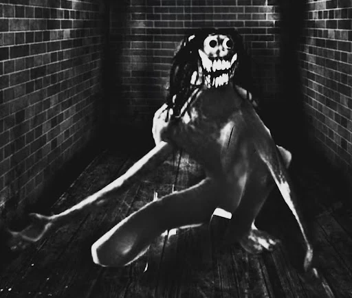 Subject 66: A humanoid; once a mentally ill patient named Richard Kneller; exceptionally pale skin; black hair; large black eyes; black lips; wide open mouth with teeth and gums protruding outwards, like a maniacal grin; never stops laughing, ever; extremely strong; when inflicted with damage, it makes an extremely eerie screaming noise, mouth elongates and pupils enlarge; contorts into unnatural positions.