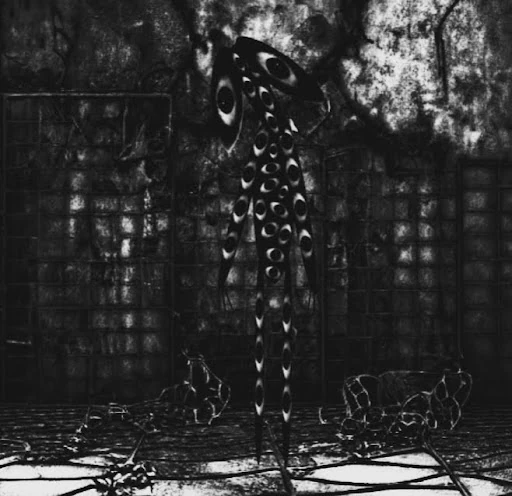 Subject 18: A humanoid; once a little girl named Johanna; tall, about 11 feet; smooth, inky black skin; no scent; has two large flap-like “ears”; long and gangly limbs that can change length at will; various eyes cover its body, unable to blink; hypnotic gaze, puts victims into a trance, form of paralysis; mimics voices and sounds, like a “hush” and are higher pitched than they should be.