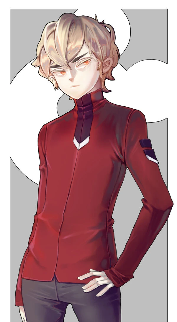 He has flowing, shiny blonde hair, golden amber eyes that glow in the dark, and they turn red when angered. He has pale skin (pale skin FOREVA), he's also very tall and skinny (body fat? What's that?) Great question.